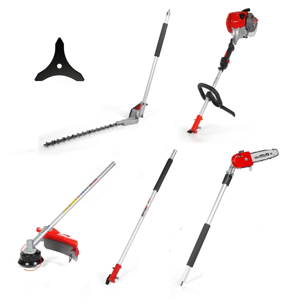 The Mitox 28MT is the larger of the Mitox multi tools. This uses a slightly newer engine with auto choke shut off as well as an easier, spring assisted recoil. This also includes an 1 metre extension shaft, unlike the smaller version, allowing you to access more difficult to reach areas. The hedgecutter attachment also gains a longer set of cutter blades and a heavier duty gearbox to drive them. It also features a grass trimmer attachment with a nylon bump feed head, with included metal blade for thicker brush. The pole pruner attachment features a high quality Oregon bar and chain.